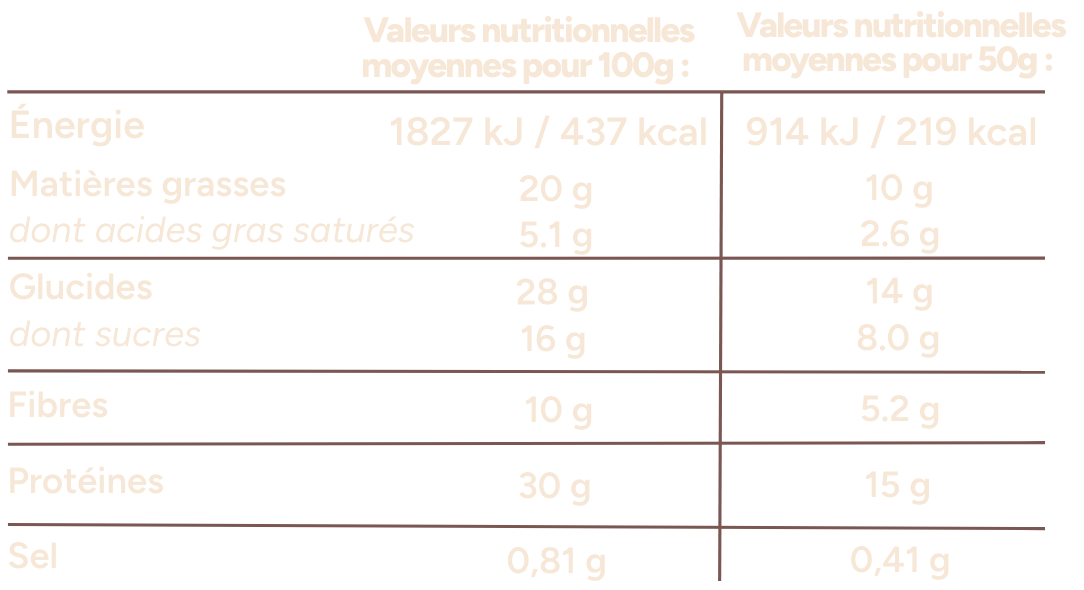 Nos protéines sont 100% végétales, mais aussi complètes : en combinant intelligemment soja, quinoa, cacahuète et graines de tournesol, on obtient un aminogramme complet, digne des meilleures protéines animales.